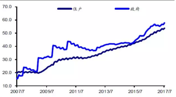 图18:中国居民和政府部门债务占GDP比(%)