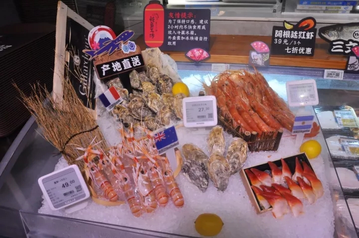 相比阿里巴巴的盒马鲜生面积更大,店内商品品类包括鲜花、日百、快餐、烘焙、海鲜、肉类等,生鲜产品占比约为75%。