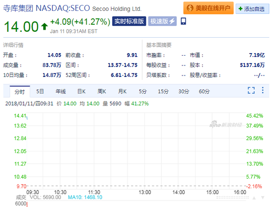 受该消息影响,寺库周三开盘暴涨逾40%,截至发稿报14.00美元,涨幅为41.27%。盘前交易中该股一度大涨70%,盘前交易量超过了近10日均量的8倍。