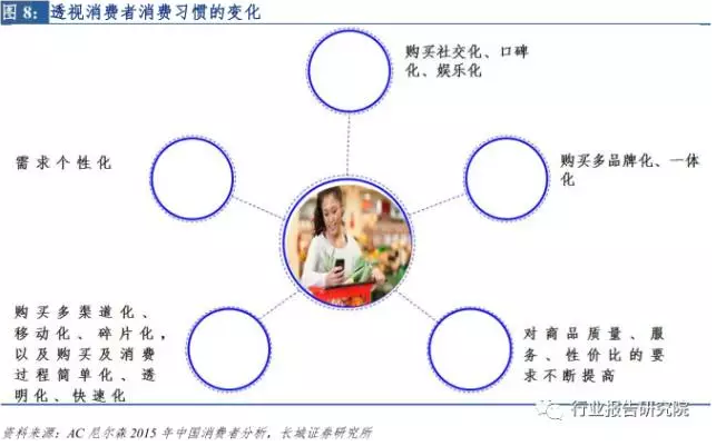 据AC尼尔森2015年中国消费者分析的结果,我国消费者行为特征已转变为:需求个性化,购买社交化、口碑化、娱乐化,购买多品牌化、一体化,对商品质量、服务、性价比的要求不断提高,购买多渠道化、移动化、碎片化,以及购买及消费过程简单化、透明化、快速化。