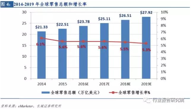 全球零售市场增速将放缓。全球零售总额在2015年达到22.5万亿美元,比2014年增长5.6%。据eMarketer预测,到2019年,全球零售总额将达到28万亿美元,但在接下来的几年中,每年的增长速度回放缓,平均增长率为5.6%。