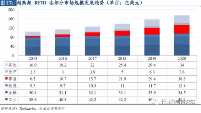 各细分应用市场而言,服装零售业使用的UHF RFID标签约占市场的8成,据IDTechEx数据,2015年销售的47.05亿个超高频RFID标签中,约37.5亿个用于服装行业。