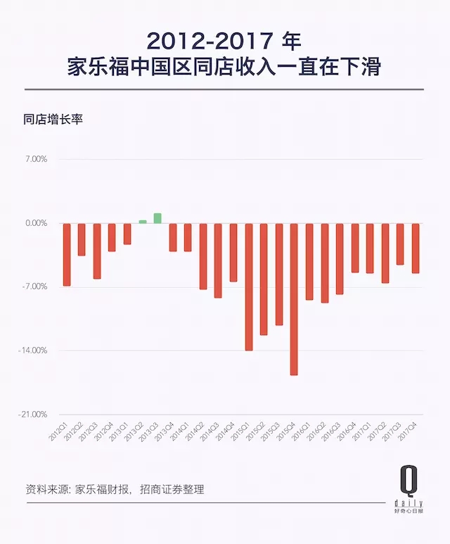 1 月 18 日,家乐福六个月内第二次下调了 2017 财年盈利预期:预计 2017 年收入增长 1.6% 至 882 亿欧元(此前的增速口径是 3%),经营利润下降 15% 至约 20 亿欧元。拖累家乐福的主要就是中国市场,其中法国同店销售增长 0.8%,亚洲下降 3.7%,中国下降 5.5%。财报中,家乐福直接把 2017 形容为“艰难的一年(A difficult year)”。
