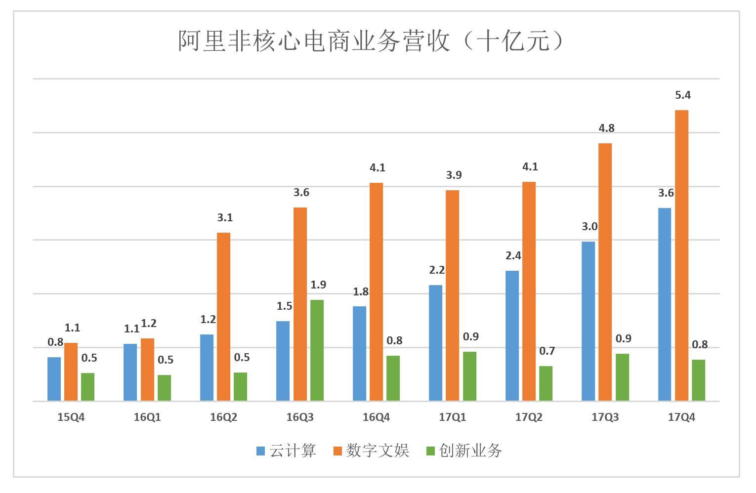 2017年Q4,非电商业务营收合计达97.8亿,占总营收的12%。其中数字文娱、云计算营收分别为54亿和36亿。