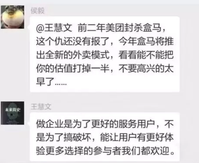 根据此前曝光的一张微信群聊截图显示,盒马有计划推出全新的外卖模式,正面与美团较量。侯毅甚至放话“看看能不能把你(美团)的估值打掉一半。”