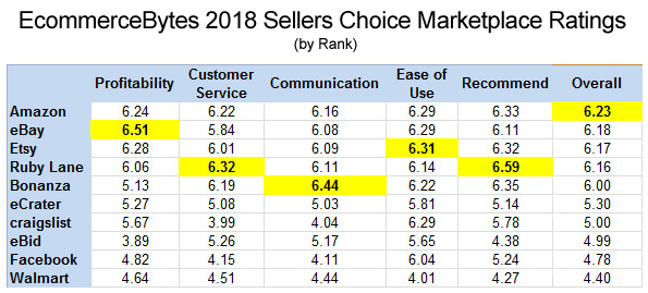 在2018年1月,电商新闻网站EcommerceBytes调查了超过10,000个在线卖家,并要求他们评估他们有过销售经验的市场。在提名过程中出现了10名入围者。他们考量四个因素:盈利能力、客户服务、沟通和易用性,亚马逊取得了综合排名第一: