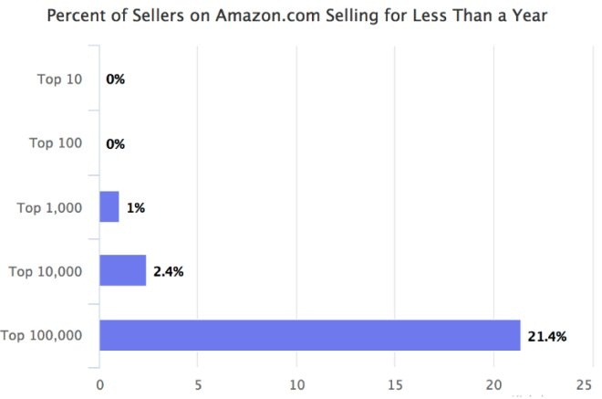 亚马逊市场的流失率相对较低,它是指在特定时间段内停止销售的市场上卖家的百分比。现在,67%出现在前1万名的卖家在去年也排在前1万名,50%的顶级卖家在两年前就是前1万名了。