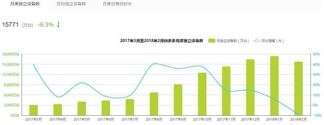 根据第三方咨询机构艾瑞咨询的研究数据显示,到2018年1月之前,拼多多的月活数据虽然一直在增长,但其环比增长率自2017年8月之后,已经曾现了逐步下滑的态势,最近几个月更加明显,到了2月,受到春节因素影响,其月活大幅下滑(不同咨询机构在数据上有较大差异,但近半年增幅逐步下滑的趋势则是基本相同的):