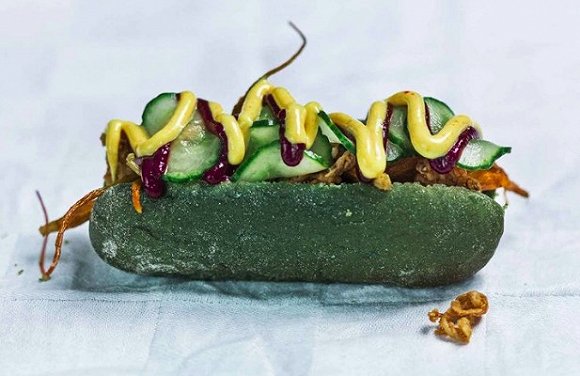 新研发的汉堡,其肉饼同样由黄粉虫和植物根茎制作,搭配上由甜菜根、黑醋栗酱、小洋葱等拌成的混合沙拉,吃起来口感并不差。而被命名为Dogless的热狗用到了胡萝卜、甜菜、浆果番茄酱、芥末、姜黄奶油、考洋葱、黄瓜等食材,绿油油的热狗面包,则通过在面包粉中加入营养丰富的藻类得来,这种藻类的含铁量是菠菜的50倍。