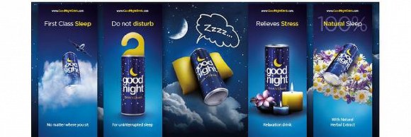Good Night Drink的广告也在强调“助眠”的效果,在静谧蓝的背景下展现了多种睡眠的问题,比如难受的飞行之旅、不被打扰的睡眠等。
