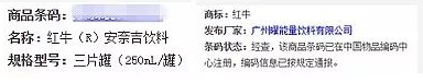 经过快速消费品精英俱乐部的多方调查,所有信息都指向了广州曜能量饮料有限公司,而我们通过扫描罐体上的条形码,淘宝显示出来的是2015年曜能量功能饮料复仇者联盟2收藏纪念限量套罐。在中国物品编码中心条码则显示为红牛 安奈吉饮料,发布厂商也为广州曜能量饮料有限公司。