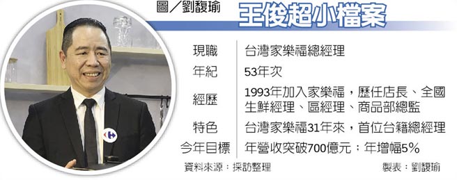 王俊超是法商家乐福在台湾31年来,首任台籍总经理,在家乐福资历迈入第26年,历任店长、区经理、商品部总监等职位,今年2月经法国总部面试认可,升任台湾区总经理。