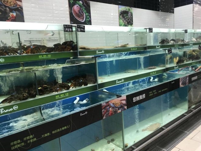 顺着小哥手指的方向望去,水产区蓝色的LED灯及其背景中游弋的各色海洋生物异常夺目。灯下,数个玻璃水槽呈环形排列,波士顿龙虾、俄罗斯帝王蟹、面包蟹等等在水中隐约可见,吸引了一票吃瓜群众的围观。不过站了半天我们发现,大部分人都只看不买,毕竟669元一只的俄罗斯帝王蟹,不是一般人能消费得起。