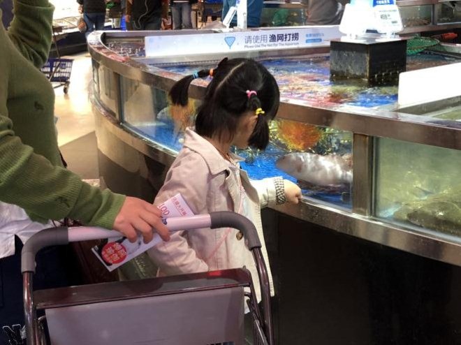 不管围观群众是否都只看不买,但这里的水产区都是孩子们的最爱:有推着童车到这儿挪不动步的,有被爸爸妈妈抱在怀里频频往水里探头的,还有拽着爷爷的手使劲儿往水槽前挤的……一双双明亮的眼睛和玻璃水缸里的龙虾、螃蟹四目相对、目不转睛,倒是相看两不厌。