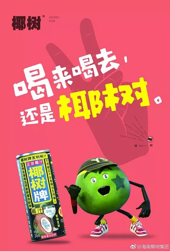 一个戴着鸭舌帽、穿着球鞋的卡通椰子成为了主角,蹦蹦跳跳地唱出了椰树椰汁的广告词:“我曾经红得像花,全球的政要大咖,来到中国找我开趴”“喝椰汁认准椰树,不添加香精色素”……