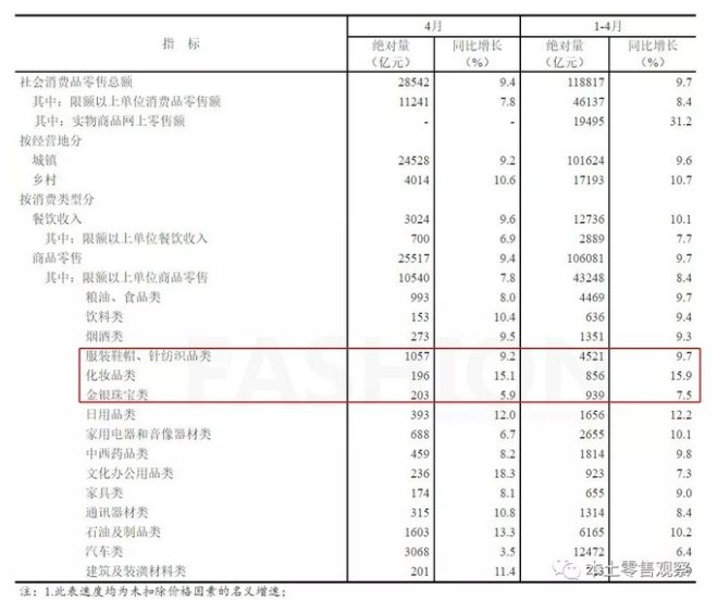 4月份,时尚类别销售仍有不错表现,特别是化妆品市场持续强劲,当月销售增幅15.1%至196亿元,唯较首季16.1%有所放缓,并拖累1-4月增速降至15.9%;服装市场增幅9.2%,同样弱于首季度9.8%;金银珠宝销售录得5.9%的增速,较首季7.9%有较大的放缓。