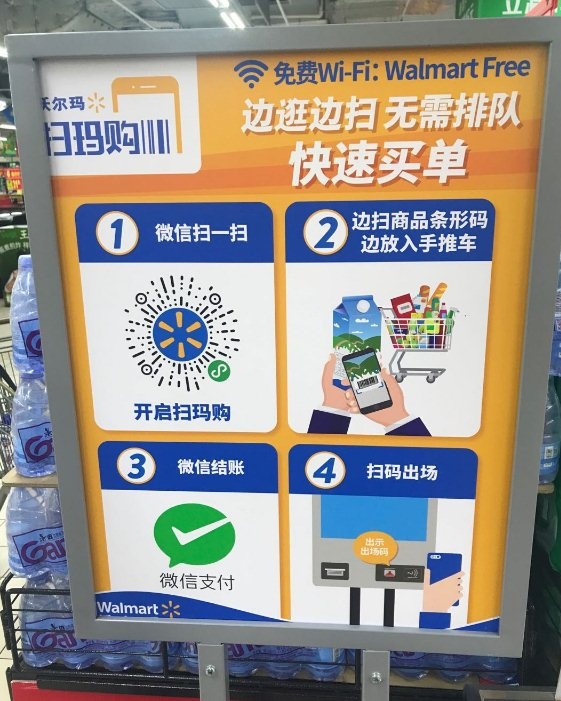 而沃尔玛的消费场景是大型超市,顾客可能会逛很长时间,选购一段时间的所需的生活品,商品的数量和种类会更多。顾客自主使用手机扫码支付,并没有比传统的收银通道方便。