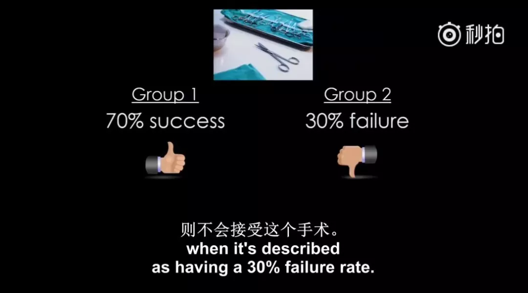 毫不意外的是,第一组人得知70%的成功率后肯定了这个手术,而第二组人得知30%的失败概率后则是反对这个手术。
