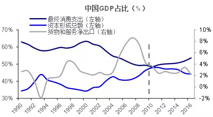 2010-17年中国第三产业GDP占比从44%提高到51.6%,消费占比从48.5%提升至53.6%。