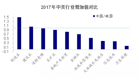 即使如此,中国的医疗保健、信息技术、文体娱乐行业增加值依然仅相当于美国的20%、38%、40%,而制造业为150%。