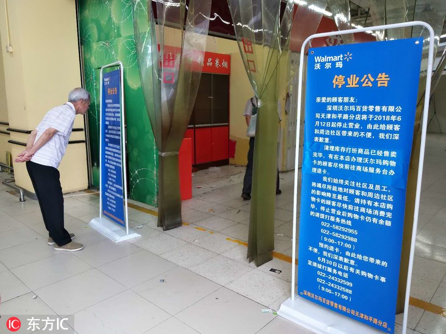 2018年6月10日,天津市和平区,天津沃尔玛和平路分店在超市门口发布告示称将停业。