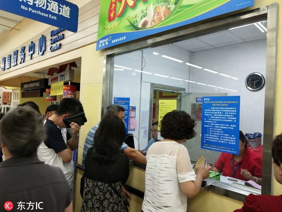 2018年6月10日,天津市和平区,天津沃尔玛和平路分店在超市门口发布告示称12日将停业。在卖场通道口,张贴着退卡注意事项,市民排长队办理退卡业务。