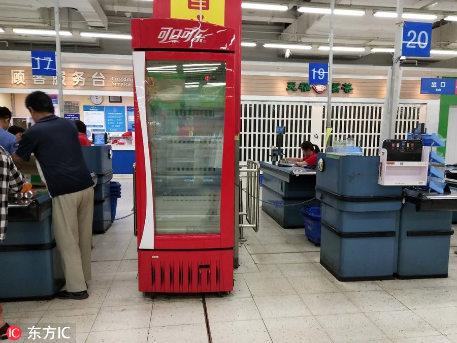 2018年6月10日,天津市和平区,天津沃尔玛和平路分店在超市门口发布告示称12日将停业。超市虽然还在营业,但是只剩少部分处理商品集中售卖,所有货架基本上空荡荡的。