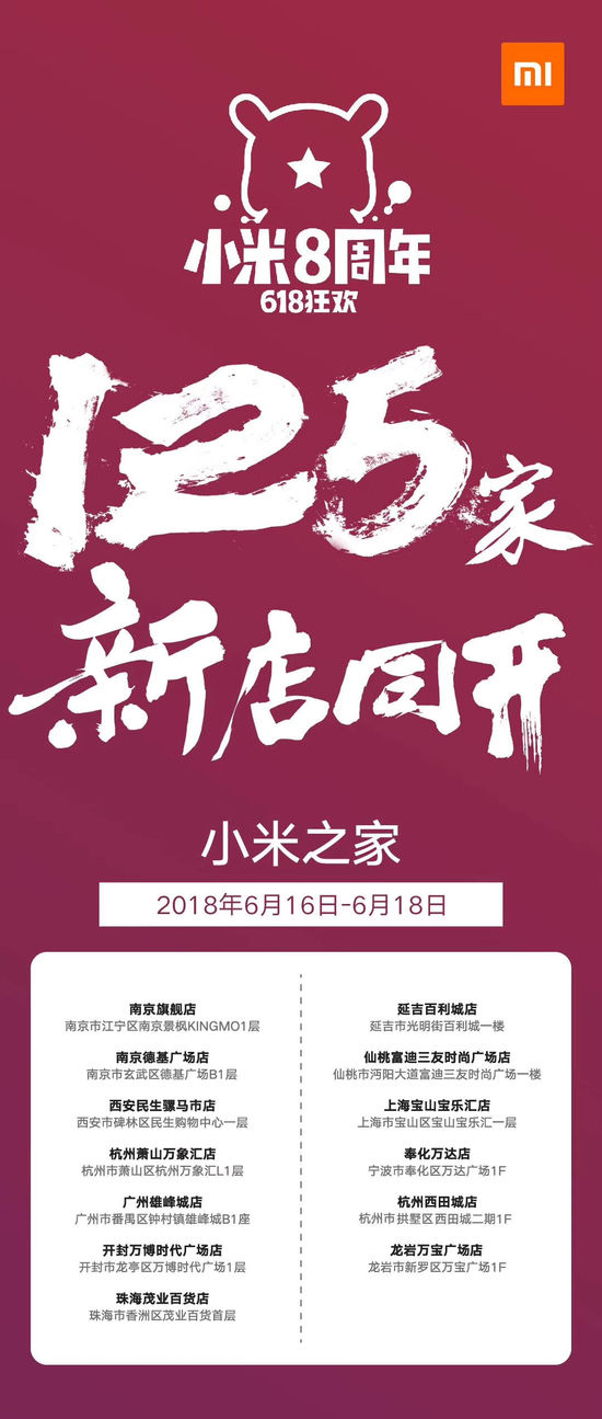 6月12日消息,小米将在618期间的6月16日-6月18日新开125家小米之家以及小米授权体验店。