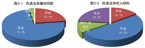 1-5月,同城、异地、国际/港澳台快递业务量分别占全部快递业务量的23%、74.5%和2.5%;业务收入分别占全部快递收入的15.1%、50.5%和10.9%。与去年同期相比,同城快递业务量的比重下降0.3个百分点,异地快递业务量的比重下降0.1个百分点,国际/港澳台业务量的比重上升0.4个百分点。