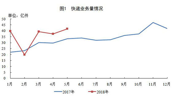 5月,全国快递服务企业业务量完成41.8亿件,同比增长25.1%;业务收入完成497.8亿元,同比增长22.2%。