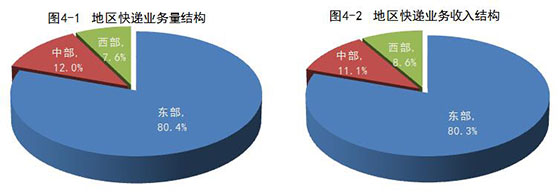 1-5月,东、中、西部地区快递业务量比重分别为80.4%、12%和7.6%,业务收入比重分别为80.3%、11.1%和8.6%。与去年同期相比,东部地区快递业务量比重下降了0.6个百分点,快递业务收入比重下降了0.7个百分点;中部地区快递业务量比重上升了0.2个百分点,快递业务收入比重上升了0.2个百分点;西部地区快递业务量比重上升了0.4个百分点,快递业务收入比重上升了0.5个百分点。
