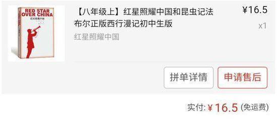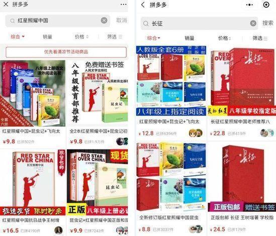 据“拼多多”手机客户端公布的销售数据(平台公布的“已拼”数量)统计,截至2018年7月27日,“拼多多”平台共低价销售《红星照耀中国》10万册以上,《长征》5万册以上,“哈利·波特”系列5万册以上,人文社版古典文学“四大名著”5千套以上。
