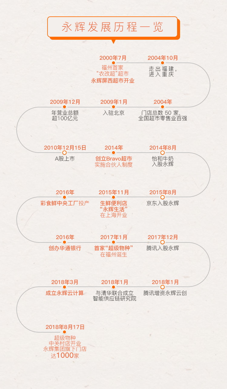 2000年,永辉在福州开设了首家“农改超”超市——永辉屏西超市,尝试把生鲜农产品引进现代超市,这也是永辉围绕生鲜事业的最早布局。4年后,也就是2004年,永辉走向西南重庆,开启新的战略要地,这一年永辉全国门店达到50家,营业额攀升至20亿。2015年11月,永辉生活首店在上海开业,带来了永辉旗下新的零售业态。2017年1月1日,首家超级物种门店登陆福州,19个月后,超级物种第51家店、永辉第1000家店落地中关村。