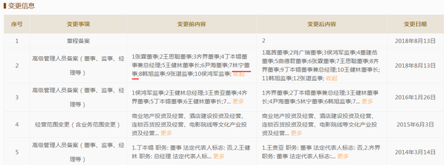 根据工商信息显示,8月13日,大连万达集团原董事尹海和林宁退出董事会,高茜、肖广瑞、董建岳和曲德君进入董事会,这四人均为万达高管。