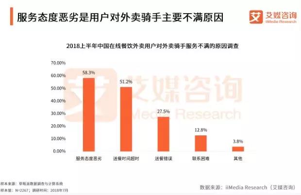 对外卖骑手服务不满因素的调查中,过半用户认为送餐时间超时和服务态度恶劣是主要因素,配送效率和服务是用户对外卖服务衡量的因素。