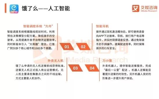 随着人工智能产业的快速发展,应用场景不断拓展,互联网餐饮外卖平台利用大数据分析、人工智能等科技创新提高外卖配送效率、降低运力成本。完善配送体系,针对骑手,加强素质培训;服务上,进一步拓展周边服务、打造贴心服务,优化平台管理系统。
