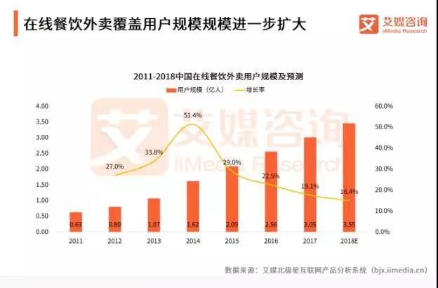 在线餐饮外卖用户增长速度趋于稳定,市场仍未饱和。2017年中国在线餐饮外卖用户规模较2016年增长19.1%,达到3.05亿人,预计2018年将达到3.55亿人。