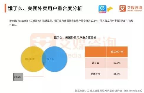 数据显示,两大外卖平台用户重合度10.5%,其中,饿了么独立用户率为57.7%;美团独立用户率为31.8%。