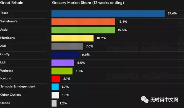 今年4月,英国超市巨头Sainsbury’s 母公司J Sainsbury plc (SBRY.L) 宣布将收购另一巨头Asda 运营商Asda Group Ltd. 阿斯达公司。以Kantar Worldpanel 最新数据,Sainsbury’s 和Asda 分占英国杂货市场15.4%和15.3%的份额,交易完成后,合并后公司在英国杂货市场的份额30.7%,将超越目前头号玩家乐购的27.4%。另外,乐购的增速低于Sainsbury’s 和Asda ,势必造成其份额进一步损失。