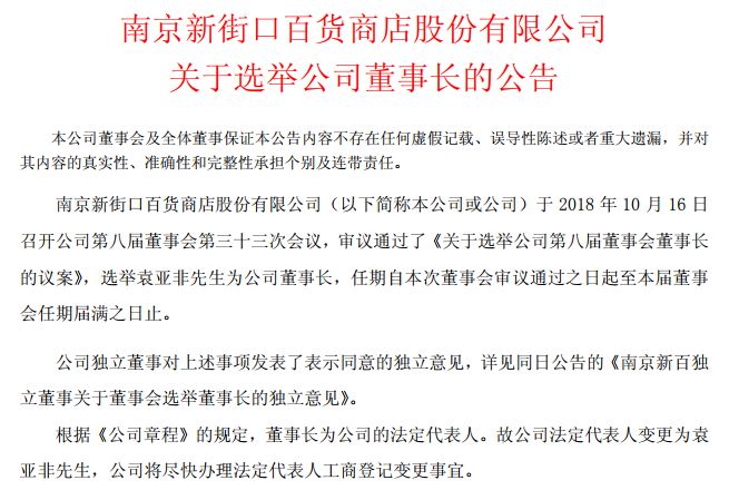 10月17日,南京新街口百货商店股份有限公司(以下简称南京新百)发布了《关于选举公司董事长的公告》,选举袁亚非为第八届董事长,并根据相关规定,将南京新百法定代表人变更为袁亚非。