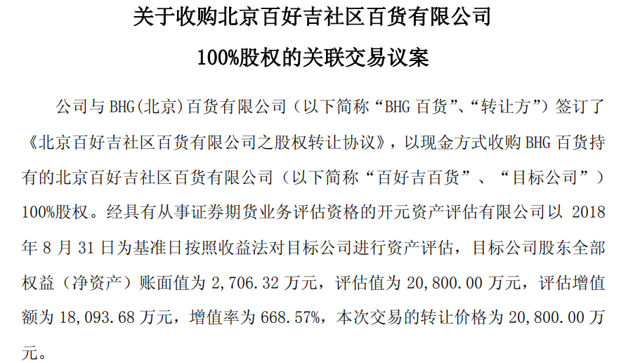 据了解,华联综超与 BHG 百货签订了《北京百好吉社区百货有限公司之股权转让协议》,以现金方式收购 BHG 百货持有的“百好吉百货”100%股权。经具有从事证券期货业务评估资格的开元资产评估有限公司以 2018年 8 月 31 日为基准日按照收益法对目标公司进行资产评估,目标公司股东全部权益(净资产)账面值为 2706.32 万元,评估值为 2.08亿元,评估增值额为 1.809368 亿元,增值率为 668.57%。