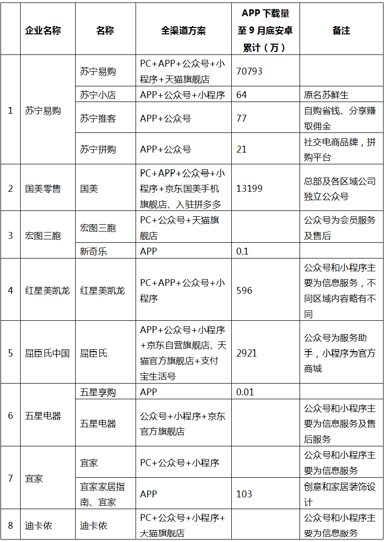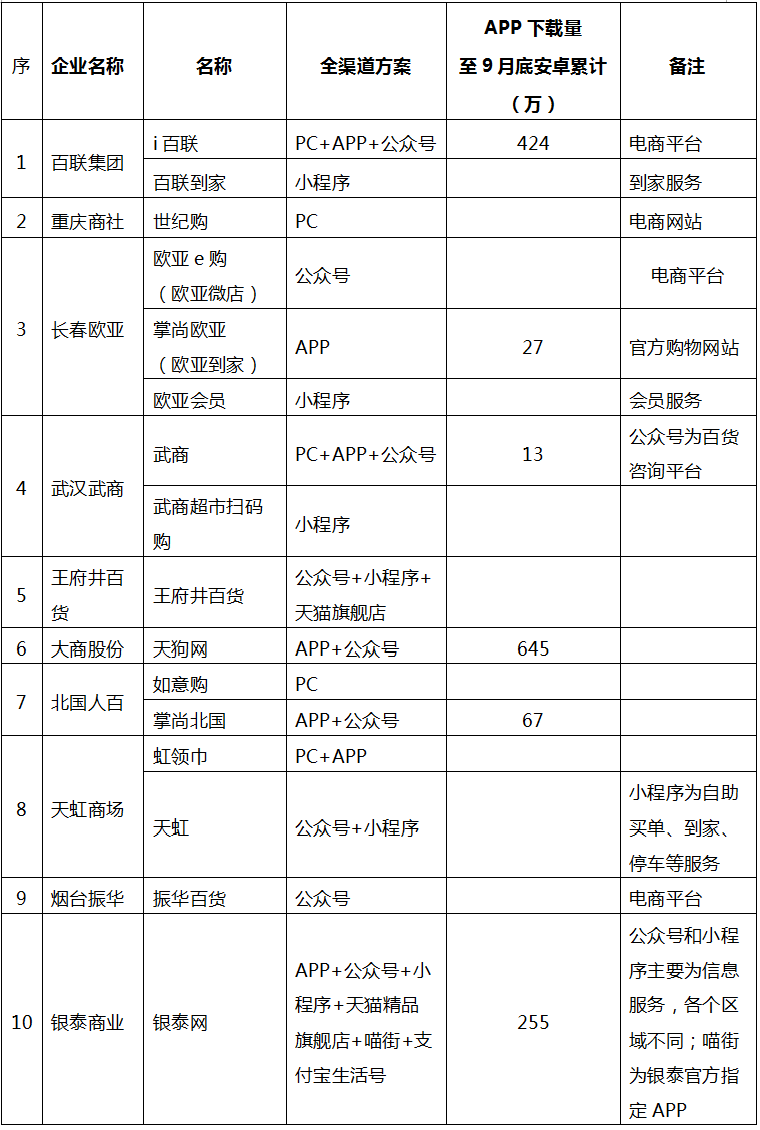 为便于比较分析,分别选取了百货、超市、便利店、专业店四个业态的主要10家企业,研究其目前的全渠道方案。