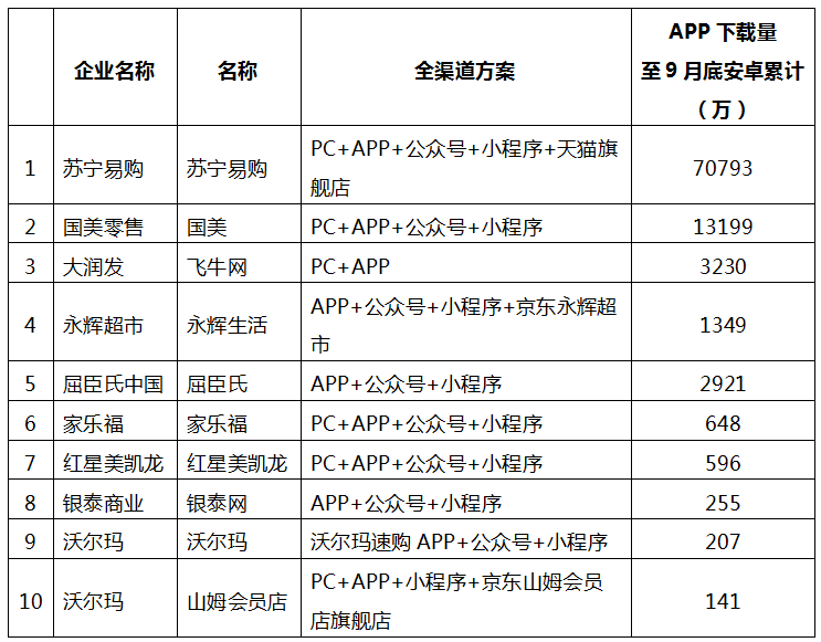 从表中我们也看到,超市行业的各类平台存在品牌不统一、渠道较为分散的情况,影响品牌的统一和流量的聚合,有进一步整合的空间。