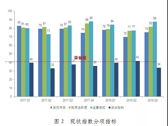 从分项指标来看,反映购物中心宏观基本面的指数“宏观市场”环比上升5.6达75.3,93.5%的业主认为项目所在城市的整体出租率与上季度持平或上升。“租赁活跃度”指数环比上升4.7,同比上升1.1至81.8,。指数的上升主要受到租赁问询量和租户品牌质量两个指标的推动,有71%的项目本季录得租赁问询量的环比增长,另有76%的项目表示租户品牌质量有所提升,市场上持续涌现的新品牌给业主带来更多的需求和选择。“运营表现”指数录得87.6,环比上升10.2,同比上升4.6。两个主要指标“销售同比增速”和“租金收入”仍然表现较好,84%的项目的销售同比增速上升,同时,78%的项目租金收入实现增长,客流量的增长是促成销售表现保持健康向上的重要推动力。本季度,有82%的业主表示项目的客流量实现增长。“成本控制”指数出现环比8.1的下跌,同比亦下降3.8。三季度迎来暑期旅游的高峰期,以奥特莱斯和都市型物业为主的购物中心加大了营销推广的投入,从而获取更多的旅游消费收入,使得成本有所上升。大数据和零售新科技的投入依然是促使业主成本上升的主要原因之一。