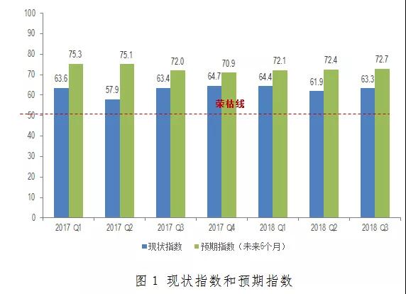 其中,现状指数为63.3,环比上升1.4,同比微跌0.1,高出荣枯线13.3。季度环比下,现状指数出现明显回升,受益于整体消费市场的平稳增长。三季度,社会消费品零售总额月度增速在9.0%上下波动,较二季度波幅逐渐收窄,并呈现稳步回升的趋势。但与去年同期增速相比,仍然减缓1.1个百分点,使得现状指数同比轻微下滑。