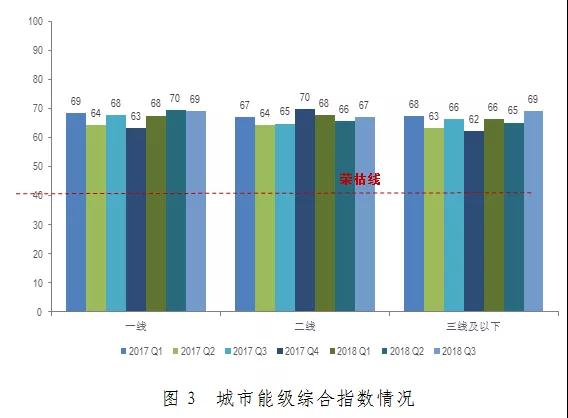 2018年第三季度,分城市能级指数表现略有不同。其中:一线城市综合指数为69.1,环比下降0.4,但同比上升1.4。成本的上升是使得一线城市指数下降的原因。但一线城市在运营能力指标上仍表现突出:100%的一线城市录得租金收入的增长,且有88%的项目实现销售同比增速的提升。二线城市指数为67.2,环比上升1.3,同比上升2.3。二线城市中,有94%的项目本季度实现客流量的环比增长。三线及以下城市为69.1,环比上升3.9,同比上升2.7。