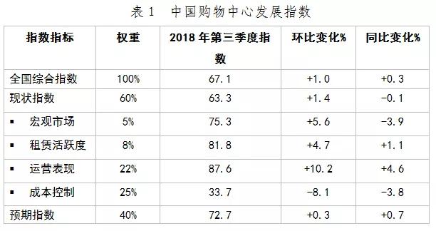 2018年第三季度中国购物中心综合指数录得67.1,环比上升1.0,同比上升0.3,且高出荣枯线17.1。整体市场保持健康向上的态势。