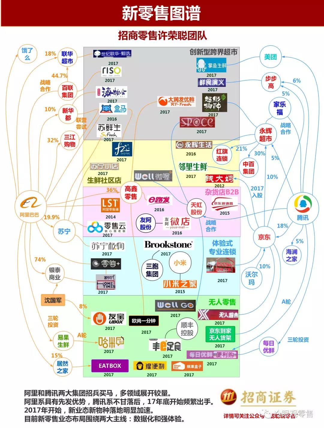 - 2018年初,我的一位好朋友,招商证券零售首席分析师许荣聪发布了一份“新零售图谱”,一时间在证券业、零售业引发了一场非常热烈且激烈的讨论,各大会议也都邀请聪聪去现场讲解这张互联网巨头和线下零售业之间发生的“圈地运动”。