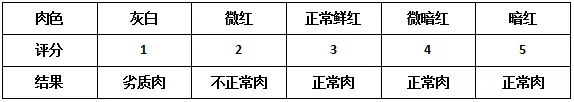 猪宰后2~3小时内取最后胸椎处背最长肌的新鲜切面,在室内正常光线下用目测评分法评定,评分标准见下表,应避免在阳光直射或室内阴暗处评定。