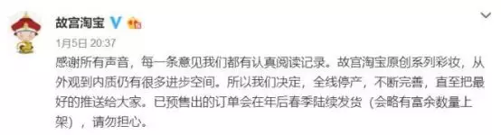 龙商网消息:1月5日,“故宫淘宝”微博发表一条消息称,因故宫淘宝原创系列彩妆,从外观到内质仍有很多进步空间,决定全线停产,但已预售的产品将正常发货。